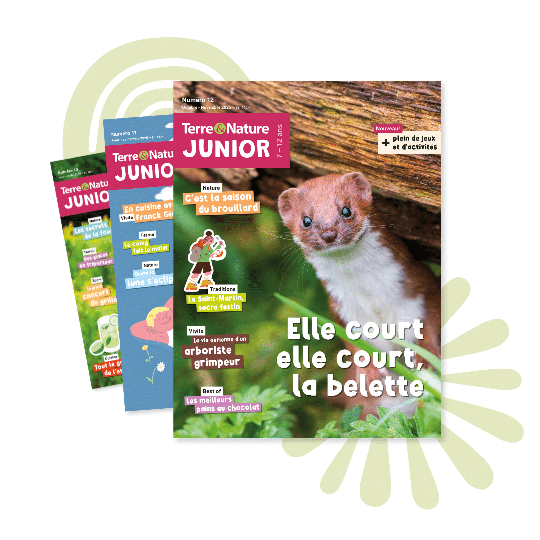 Abonnement Terre&Nature Junior : magazine romand 100% nature pour les 7-12 ans, 6 numéros par an avec illustrations, bricolage et découvertes ludiques des régions.