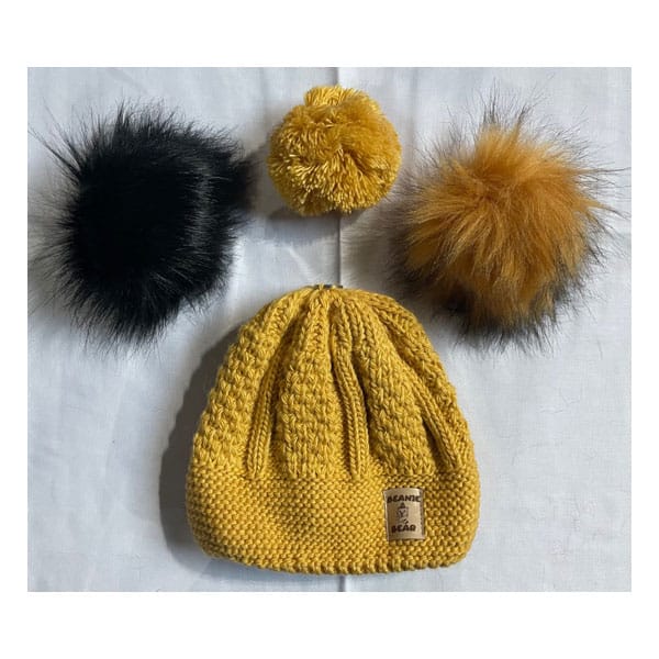 Bonnet jaune avec trois pompons. Un bonnet adulte unisexe, fabriqué en Europe, avec 3 pompons interchangeables en fausse fourrure, créé en France et Suisse.