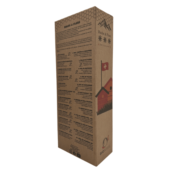 Produits certifiés Bio-Suisse : Miel d’acacia, Miel de fleurs de printemps, Miel de montagne, Miel de mille fleurs, Miel de tilleul, Miel de tournesol, Miel de fleurs d’été, Miel de rhododendron, Miel de châtaignier, Miel de miellat, Miel enrichi à la propolis, Pollen de fleurs