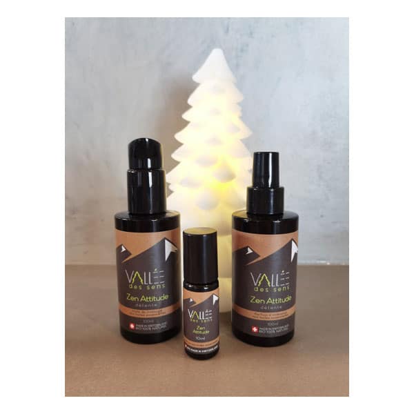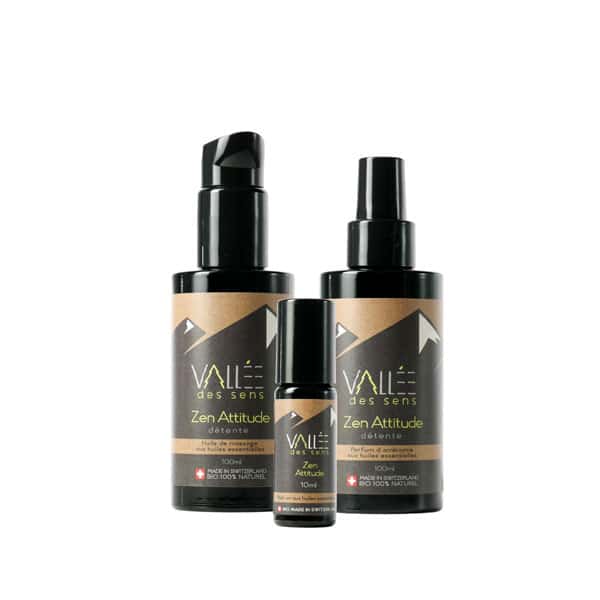 Coffret bio Zen attitude de Vallée des Sens : un parfum d’ambiance, un roll-on et une huile de massage bio pour se détendre, inspirés par la nature alpine.