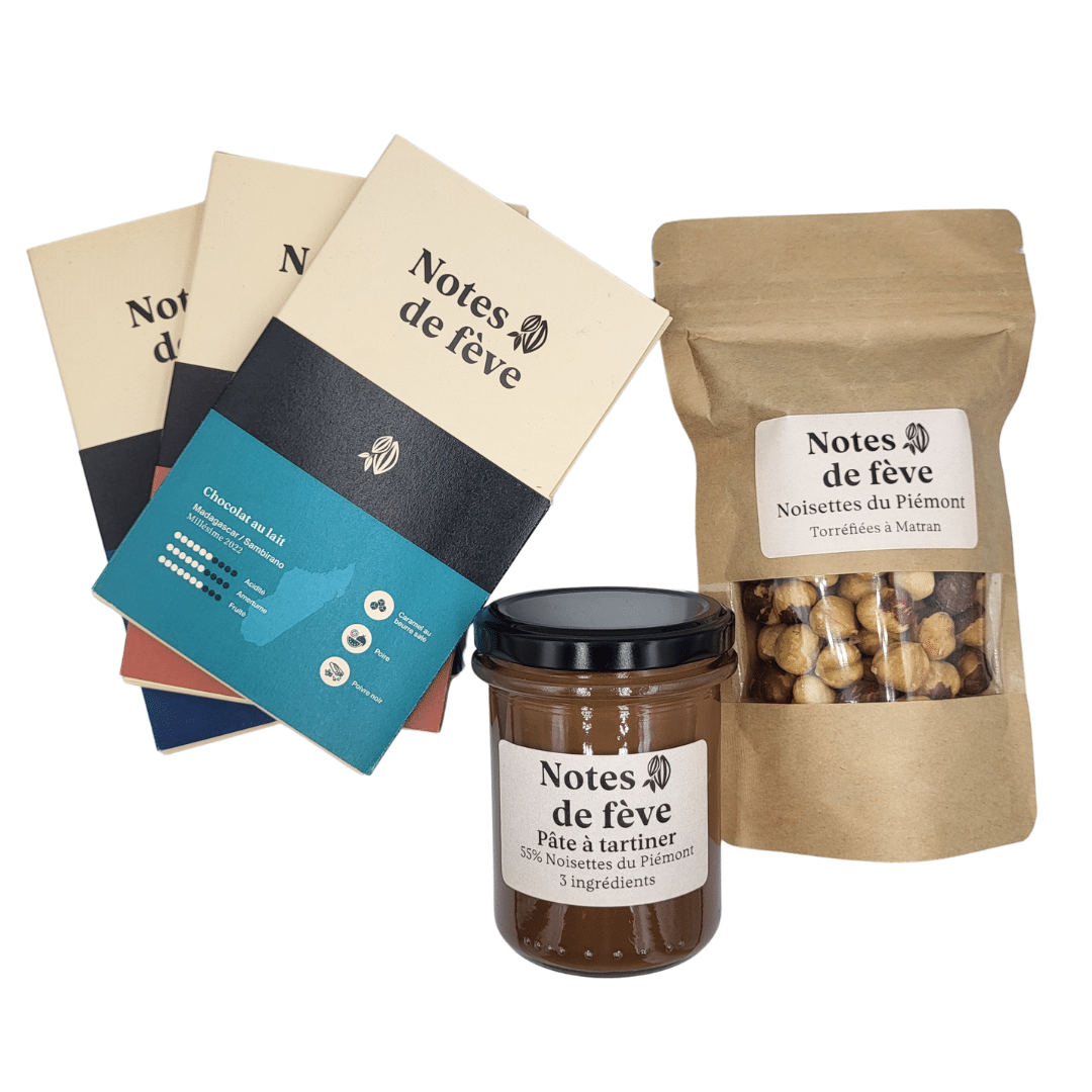 Composition du coffret : 3 tablettes de 70g + 1 pâte à tartiner + 125g de noisettes