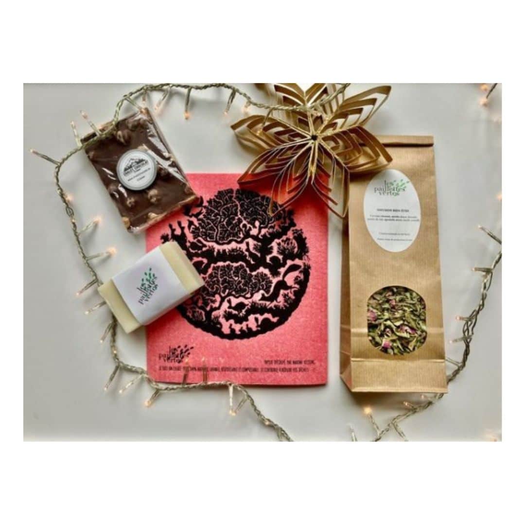 Coffret éco-responsable Les Paillettes Vertes : carré essuie-tout, savon au miel, chocolat aux noisettes et tisane bien-être, made in local et artisanal.