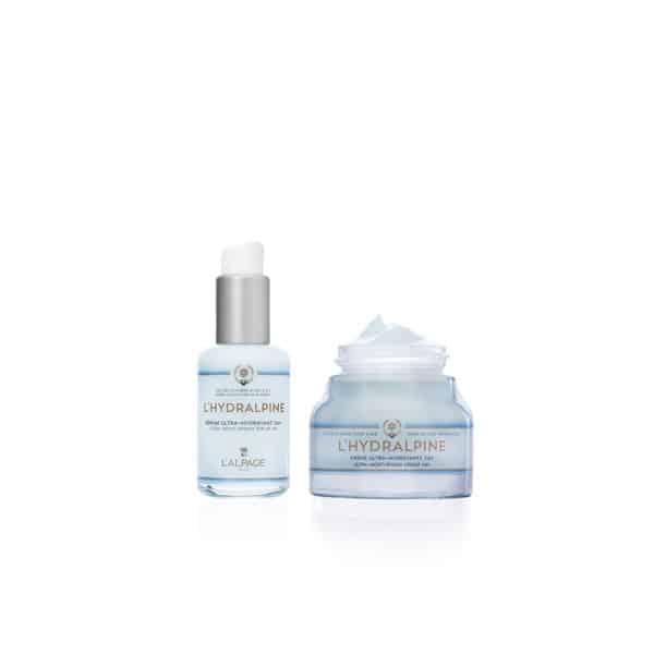Coffret Hydratant Visage L’Hydralpine : crème et sérum ultra-hydratants 24h à base d’Eau des Glaciers et de Blé, pour une hydratation intense et naturelle du visage.