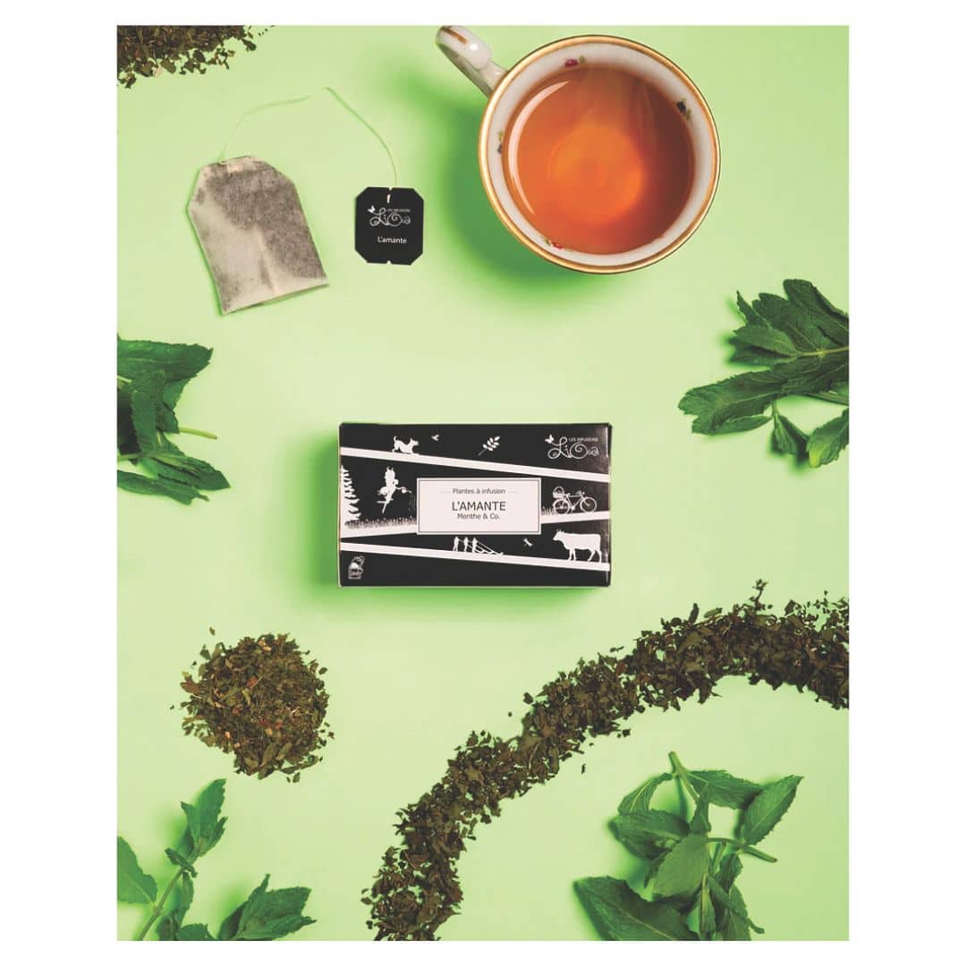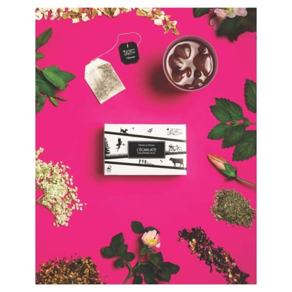 Coffret infusions L’amante et l’écarlate : deux mélanges de plantes soigneusement choisies, 20 sachets de menthe et de fruits rouges, dans une boîte en métal édition limitée.