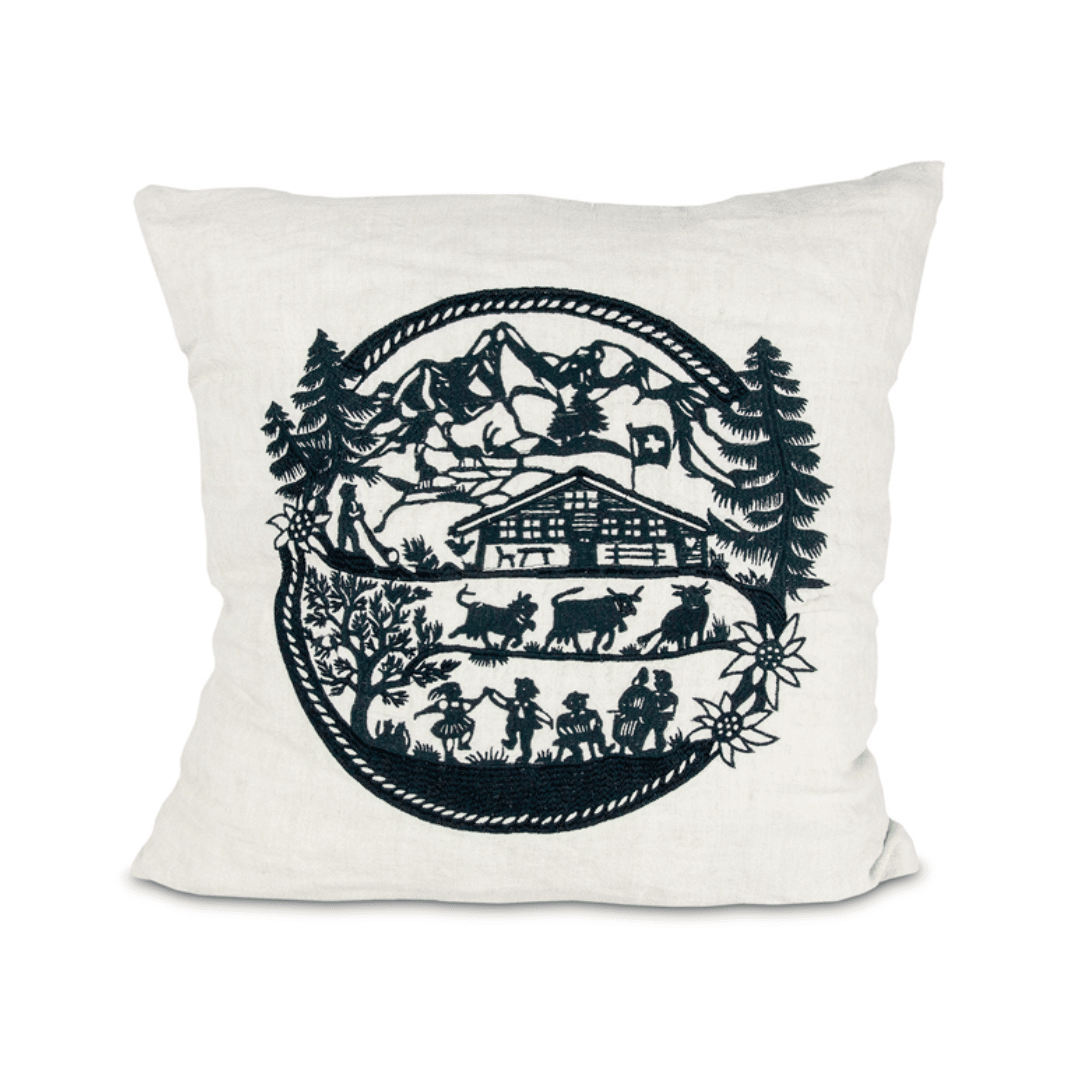 La collection «Alpine Moments» promet chaleur et confort – combinés avec un design à la fois traditionnel et moderne. Les coussins de cette collection sont minutieusement tissés à la main à partir de 100% de lin. La silhouette exceptionnelle «Le Chalet» d’Esther Gerber est appliquée avec plus de 108’000 points de coton recyclé et complète ainsi parfaitement le confortable coussin de style chalet chic.