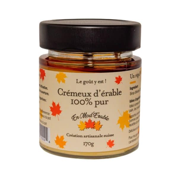 Le vrai nom au Québec est « Beurre d’érable ». Nous devons l’appeler « Crémeux d’érable » car le nom « Beurre » est protégé en Suisse.
