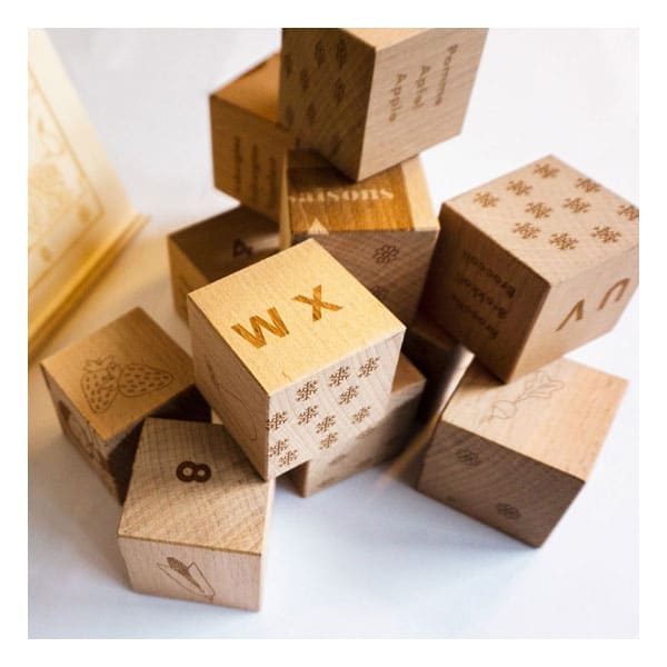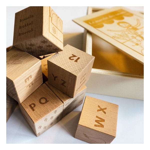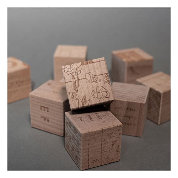 Le jeu contient douze cubes en bois gravés sur les six faces avec un contenu qui permettra aux enfants d’apprendre sur des fruits et légumes suisses, des nombres (0-12), l’alphabet (A-Z) et des langues (FR, DE, EN).