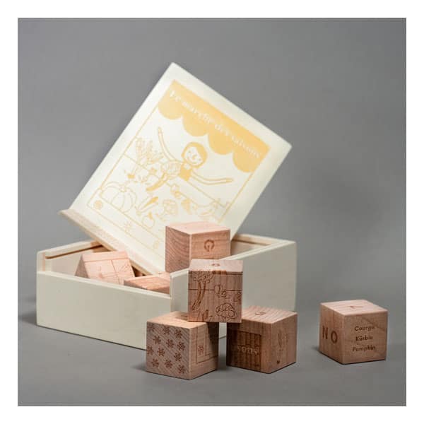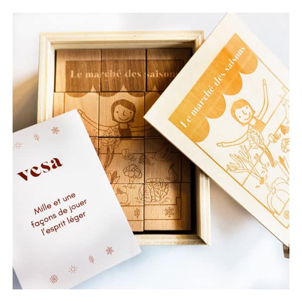 Le jeu de cubes VESA le Marché des saisons est entièrement en bois suisse et est fabriqué à Fribourg.