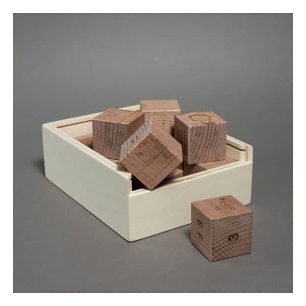 Les cubes sont en bois de hêtre et en contreplaqué de peuplier pour la boîte.