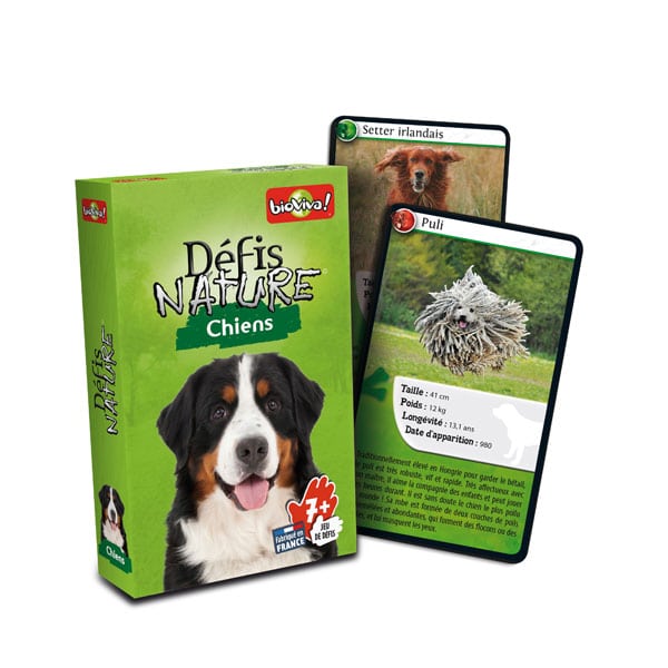 Défis Nature – Chiens : un jeu de cartes passionnant pour découvrir les espèces canines les plus surprenantes et s’affronter en famille dès 7 ans, de 2 à 6 joueurs.