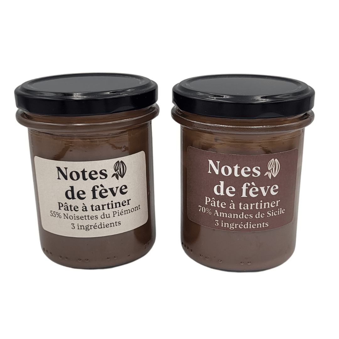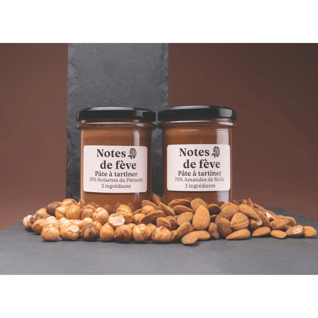 Avec 55% de noisettes du Piémont pour l’une et 70% d’amandes de Sicile soigneusement torréfiées pour l’autre, les pâtes à tartiner Notes de fève sont irrésistibles. Onctueuses, elles ne sont composées que de trois ingrédients: des fruits secs, de la poudre de cacao et du sucre. Un délice chocolaté !