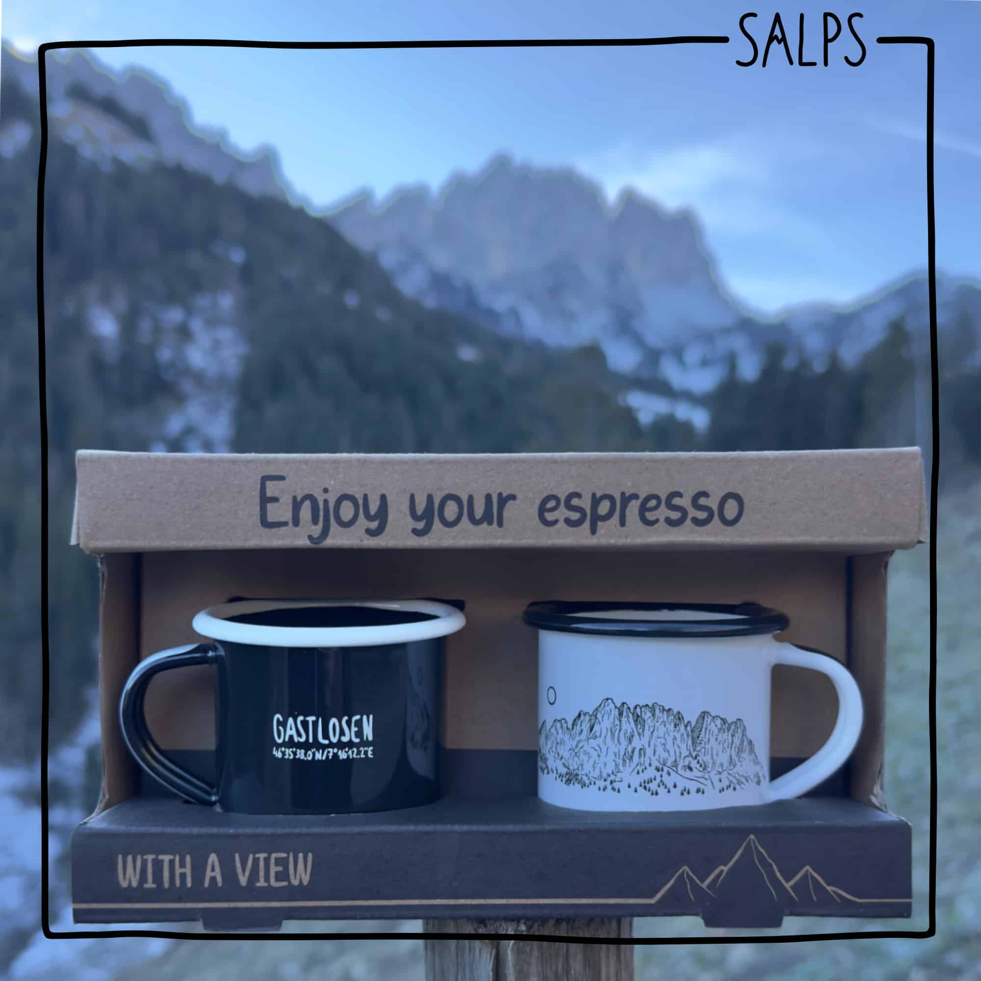 Ce duo de petites tasses émaillées rend hommage aux mythiques Gastlosen. Robustes, légères et incassables, elles vous accompagnent partout : à la montagne, en randonnée ou à la maison. Leur design épuré, inspiré de la buvette des Sattels, évoque la beauté sauvage de ce chaînon emblématique des Préalpes fribourgeoises. Un set à offrir ou à s’offrir pour savourer chaque gorgée avec un esprit d’aventure.