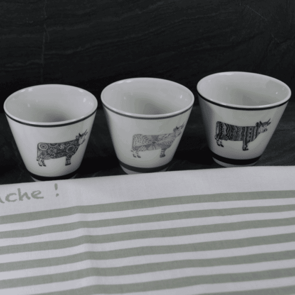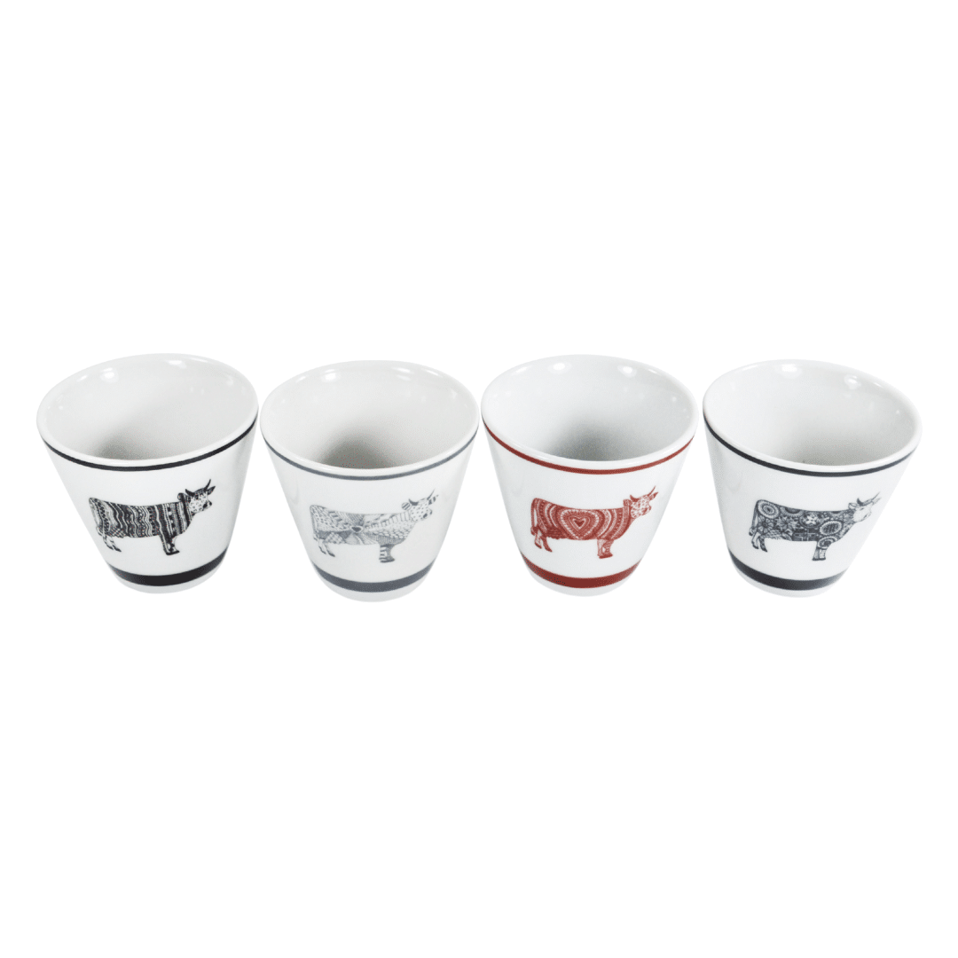 Ensemble de 4 tasses à expresso – Oh la vache ! : tasses en porcelaine illustrées avec humour, rendant hommage à la vache suisse dans un style contemporain et chaleureux.