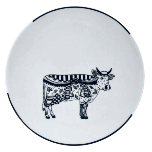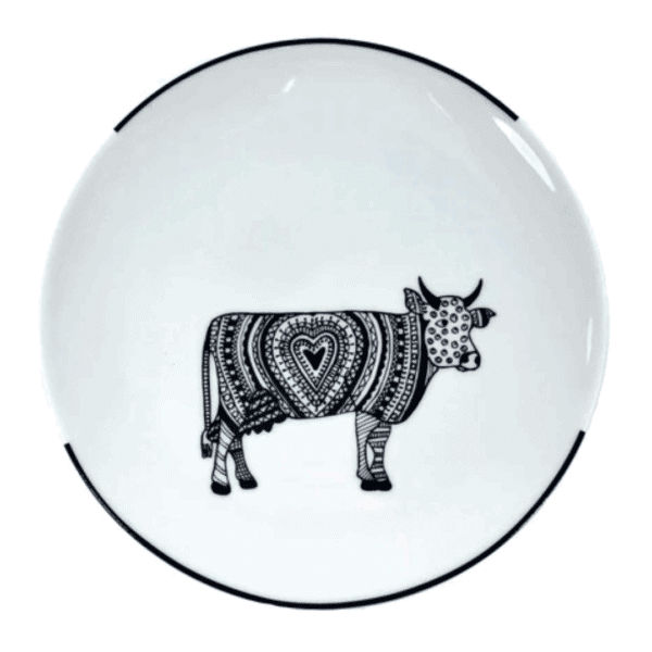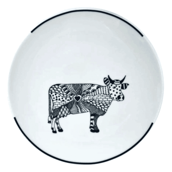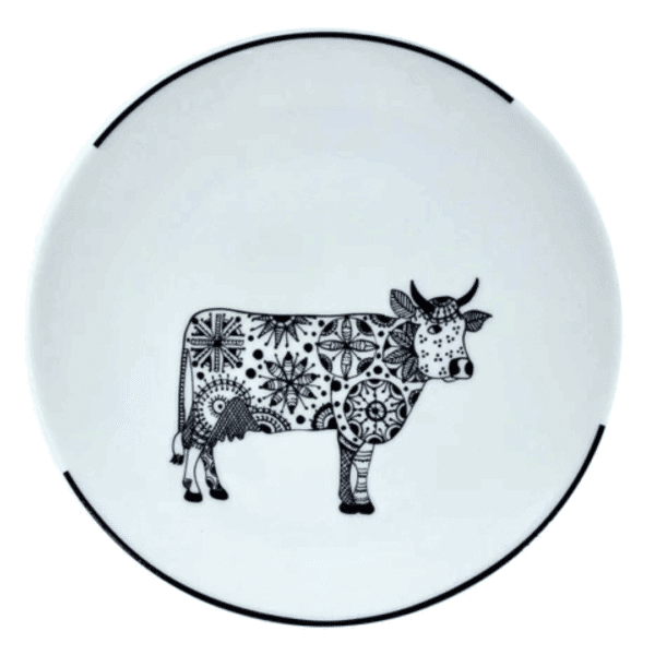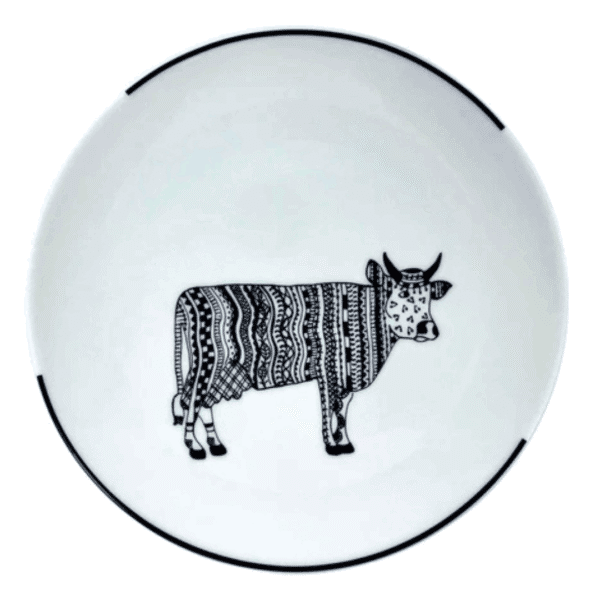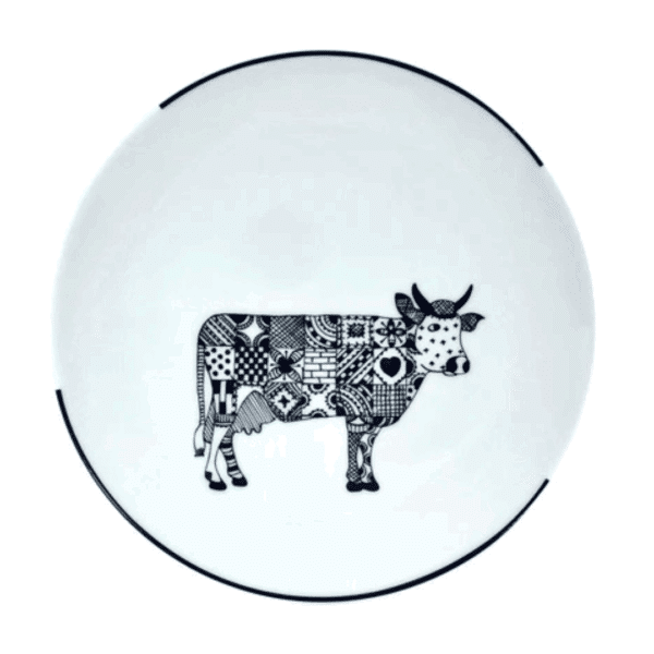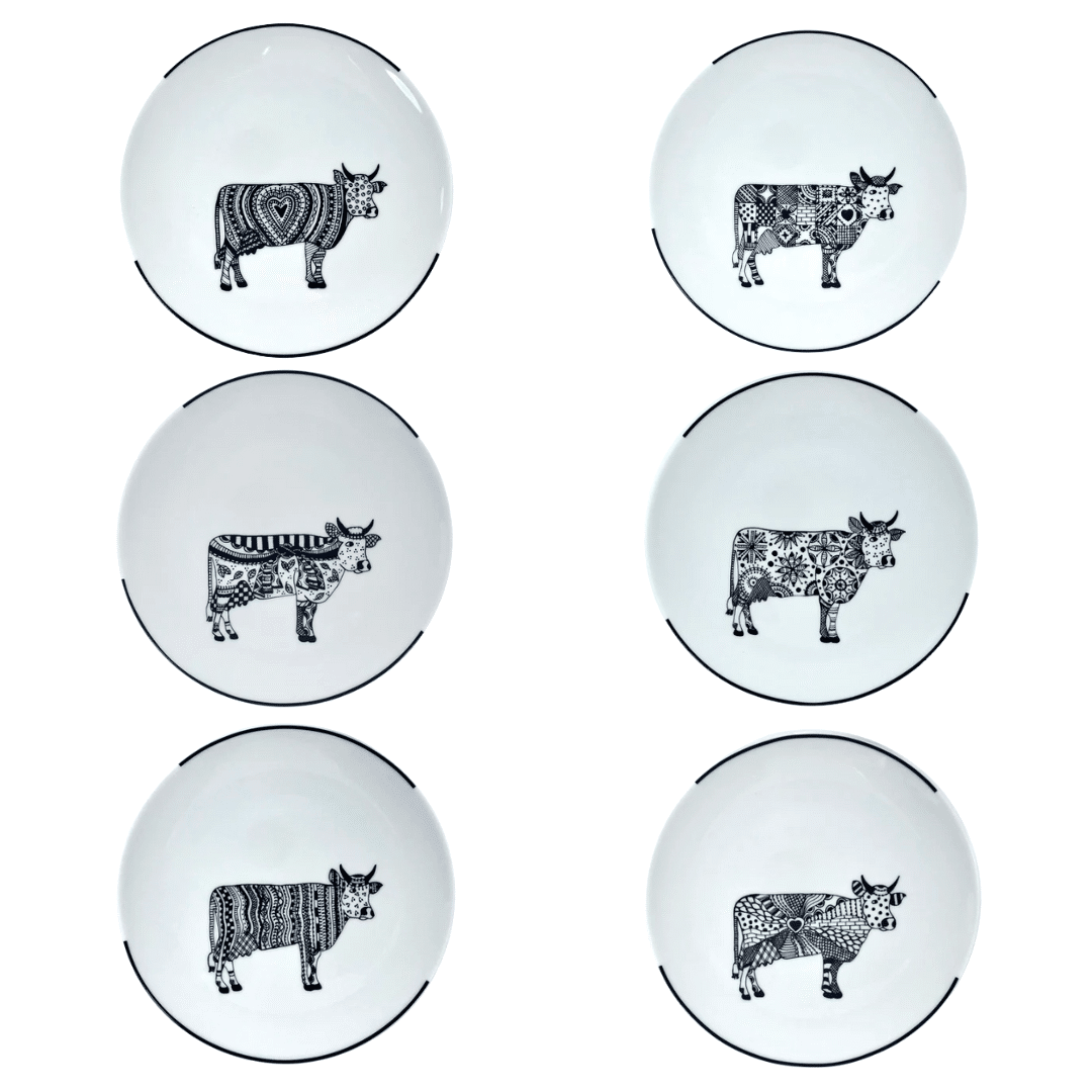 Ensemble de 6 assiettes à fondue – Oh la vache ! : un service en porcelaine illustré de vaches humoristiques, créé par une artiste britannique dans les Alpes vaudoises.