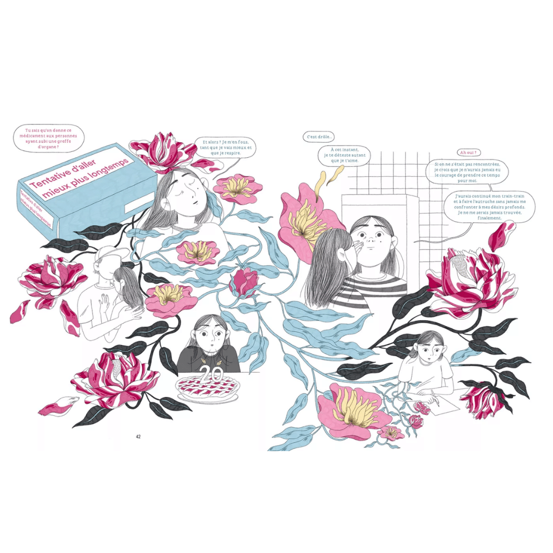 Avec Fleurs intestinales, Vamille signe un roman graphique intime et sensible sur la maladie, la résilience et la construction de soi. Entre noir, gris et touches de rose, son dessin transforme une expérience douloureuse en un récit profondément humain et plein d’espoir.