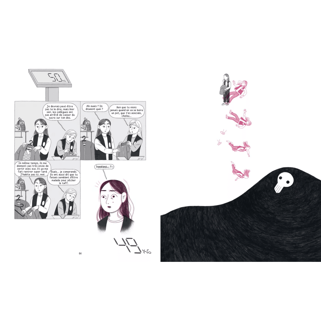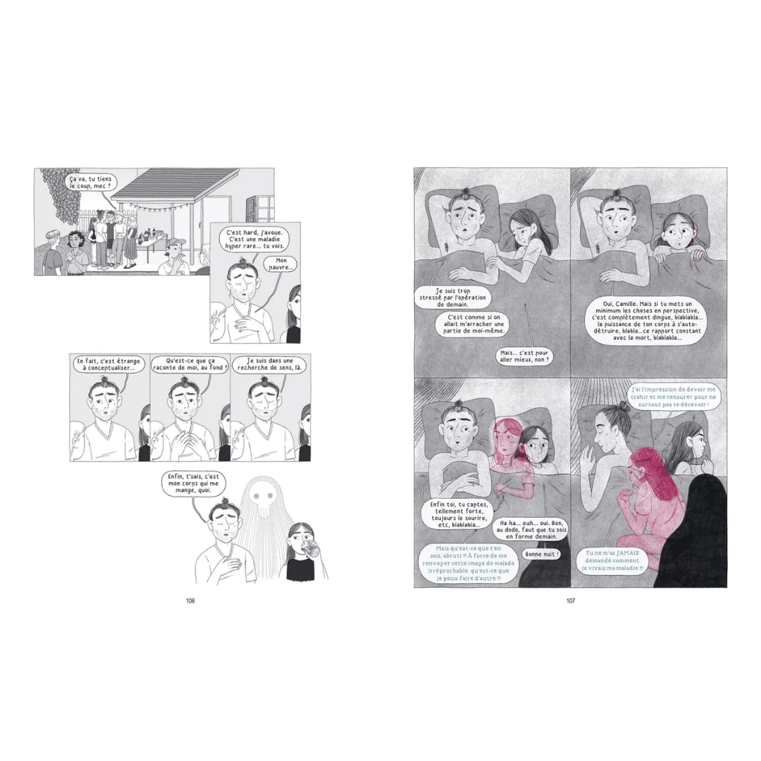 Manger, sortir, voyager, aimer, dessiner : tout devient plus compliqué. Camille doit désormais composer avec cette présence invisible qui l’accompagne partout. Au fil du récit, la maladie prend une forme presque réelle, comme une ombre avec laquelle elle apprend peu à peu à cohabiter.