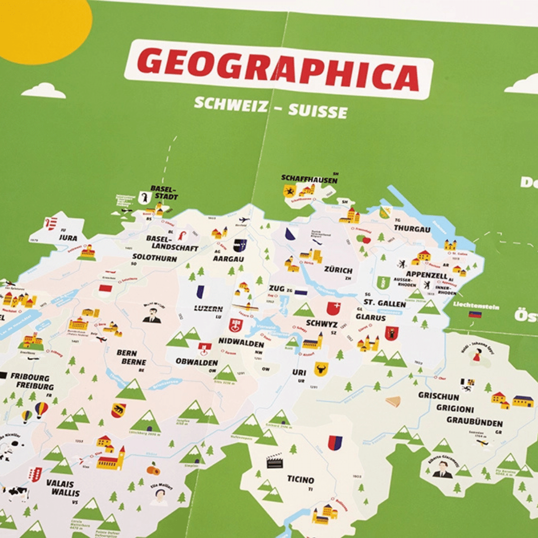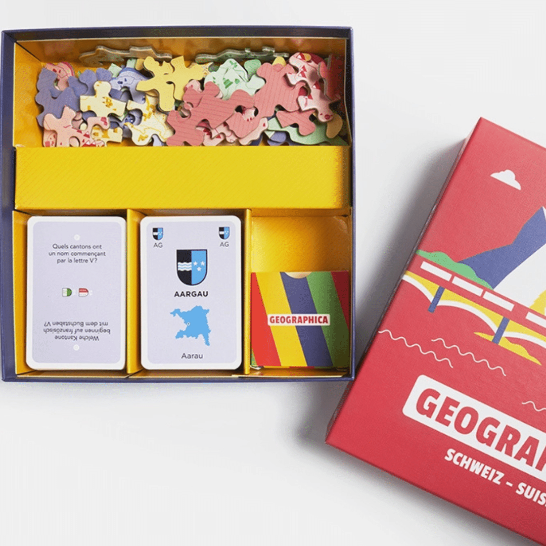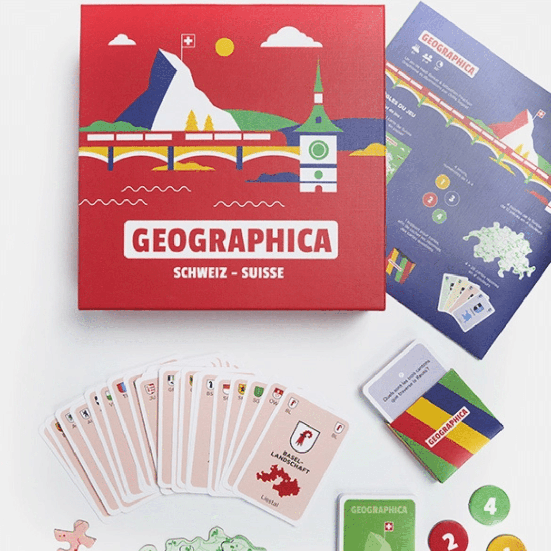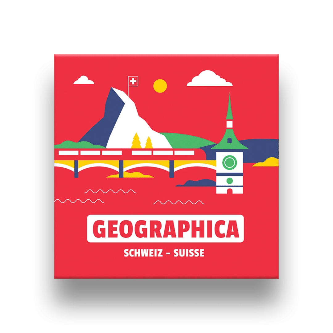 Avec Geographica Suisse/Schweiz, tout le monde peut gagner, peu importe ses connaissances. Répondez aux questions en utilisant vos cartes représentant les cantons suisses et observez attentivement la carte géographique pour trouver les réponses aux 220 questions du jeu. Rapidité et sens de l’observation feront la différence : la personne qui termine son puzzle de la Suisse en premier remporte la partie.