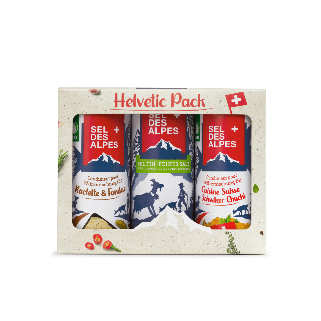 Le Helvetic Pack réunit sel fin et condiments bio spécialement conçus pour sublimer toutes vos spécialités suisses: fondue, raclette, röstis ou émincés à la zürichoise.