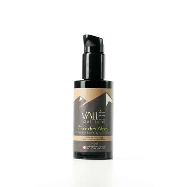 Huile de Massage Bio – Élixir des Alpes : huile 100% bio aux huiles essentielles drainantes et amincissantes, pour un massage bien-être qui sublime la peau et élimine les toxines.