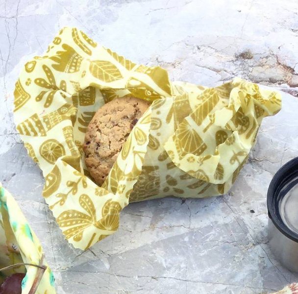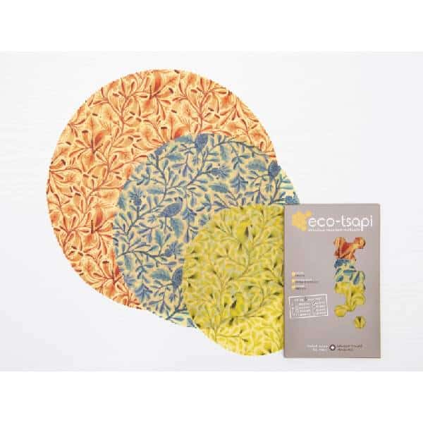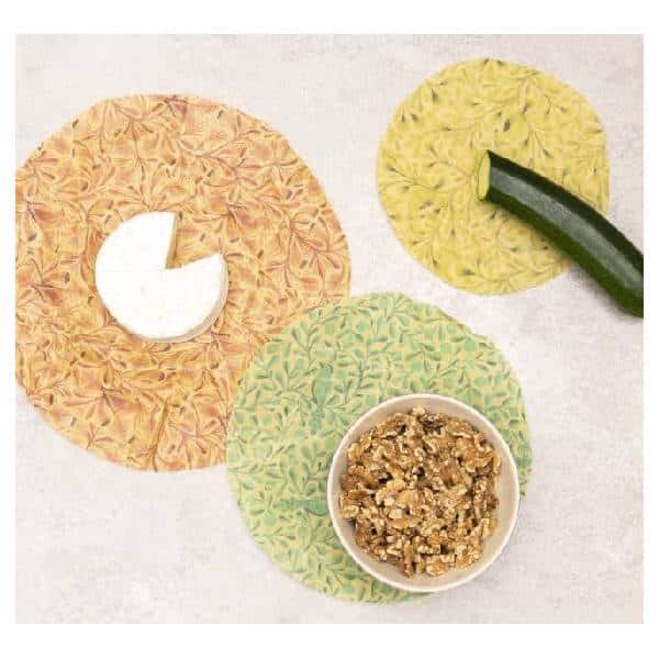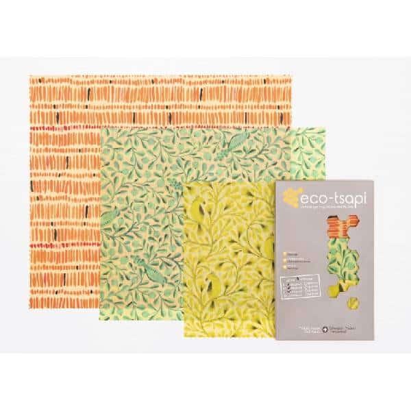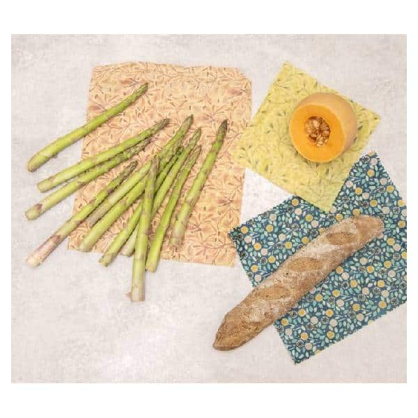 Emballages alimentaires Eco-Tsapi en coton bio et cire d’abeille. Réutilisables, lavables, sans plastique. Conservent la fraîcheur des aliments. Disponibles en packs rectangles et ronds.