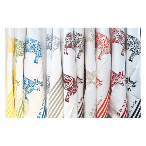 Linge de cuisine Oh la Vache ! en coton, motifs vaches graphiques. Design alpin, robuste et absorbant, créé par une illustratrice britannique dans les Alpes vaudoises.