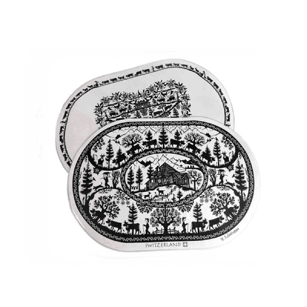 Lot de 2 sets de table Poya recto/verso. Motifs découpages traditionnels suisses en plastique. Format 42 x 29 cm, 2 designs différents pour une table 100% helvétique.