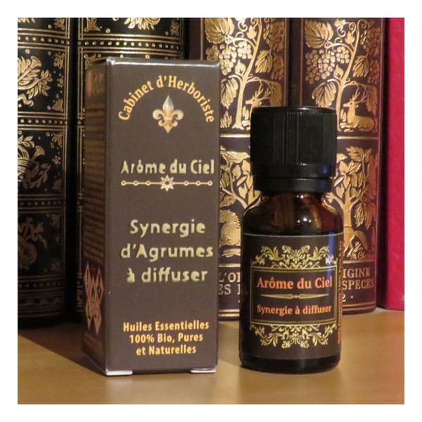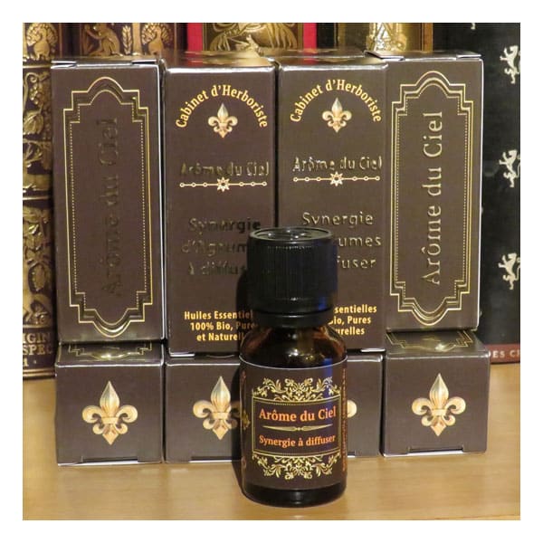 Arôme du Ciel : synergie d’huiles essentielles bio aux agrumes. Mélange rare et puissant contre le stress, relaxant et dynamisant, pour une diffusion atmosphérique optimale.