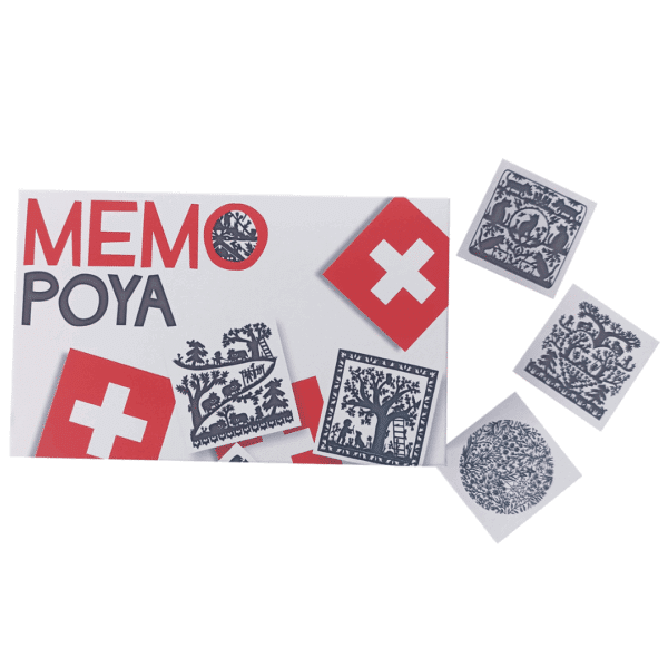 Memory Suisse – Poya : un jeu de mémoire familial dès 5 ans, créé par Catherine Collet-Matringe. Reconstituez 24 paires sur le thème de la poya et découvrez l’art du découpage helvétique.