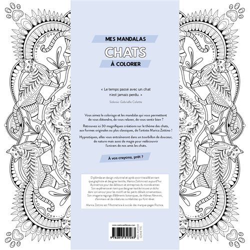 Retrouvez 30 magnifiques créations aux formes originales ou classiques. Colorier des mandalas est une bonne façon de vous détendre. L’artiste Marica Zottino vous emmène dans un tourbillon de douceur et vous fait (re)découvrir l’univers de nos animaux à quatre pattes, les chats !