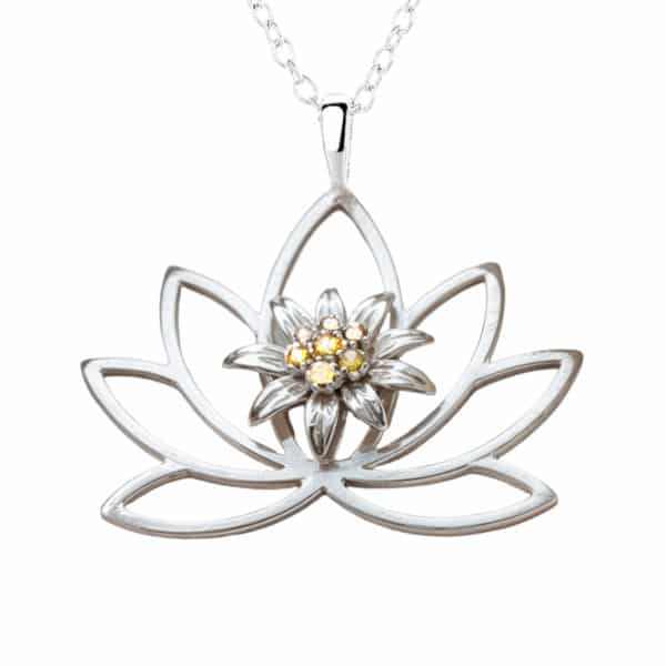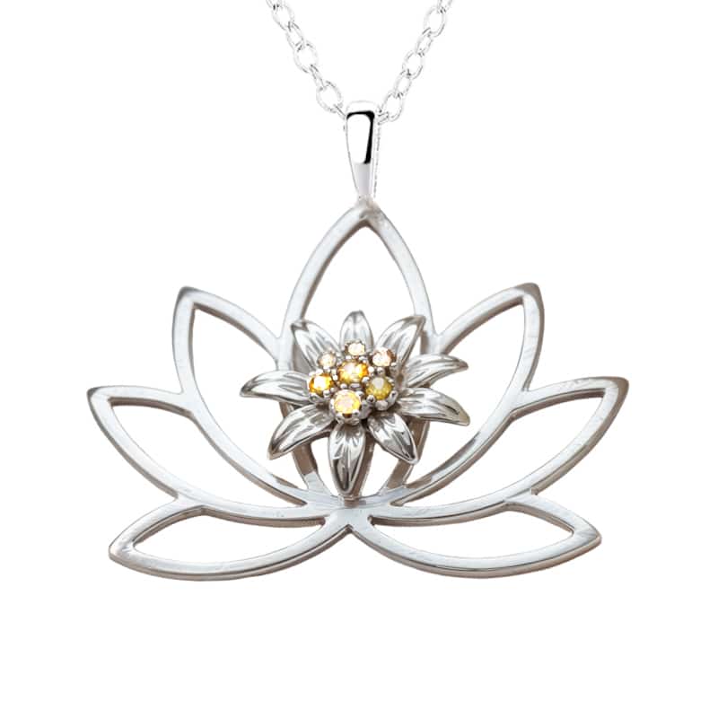 Pendentif en argent 925 en forme lotus avec un petit edelweiss et des zircons transparents. Livré dans un écrin avec une chaîne. L’edelweiss et le lotus ont une finition en argent rhodié.