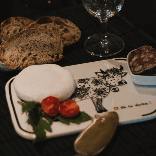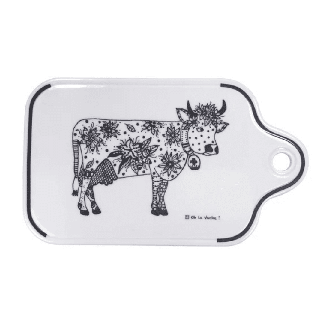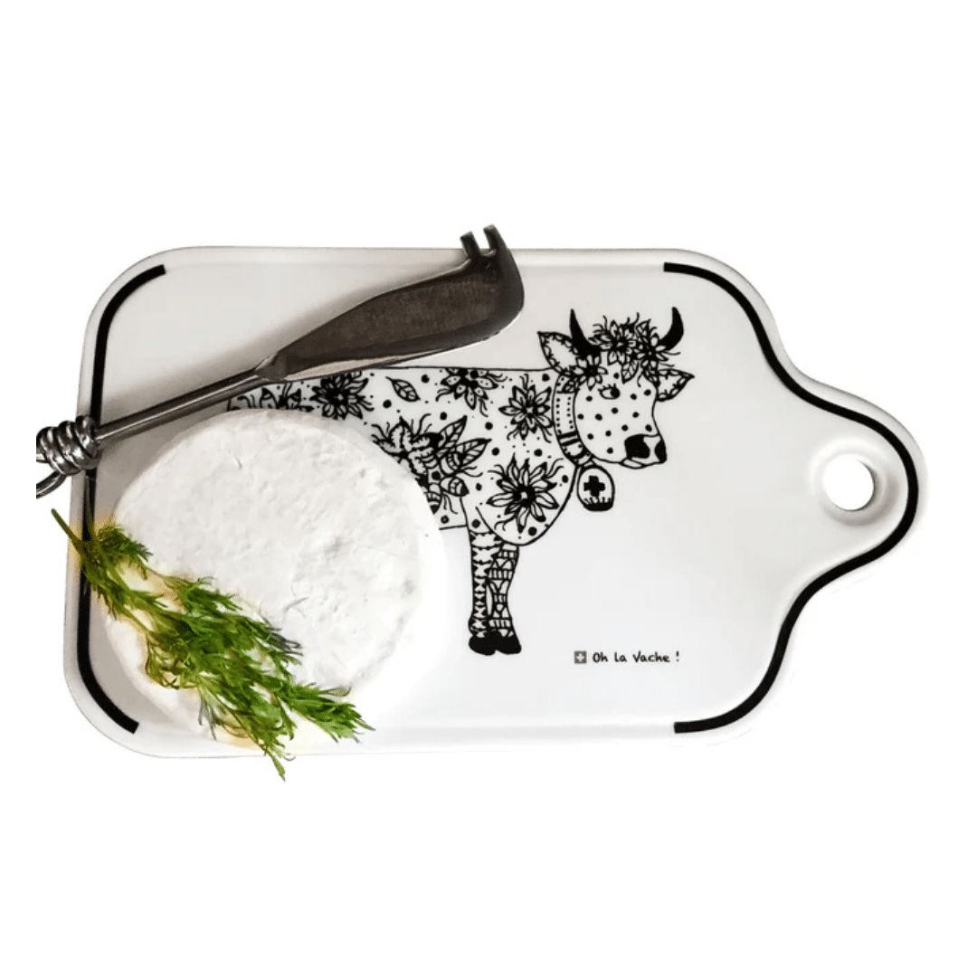 Plateau de fromages Oh la vache ! : un plateau en porcelaine graphique et élégant, créé par une illustratrice britannique dans les Alpes vaudoises, pour présenter vos fromages avec style.