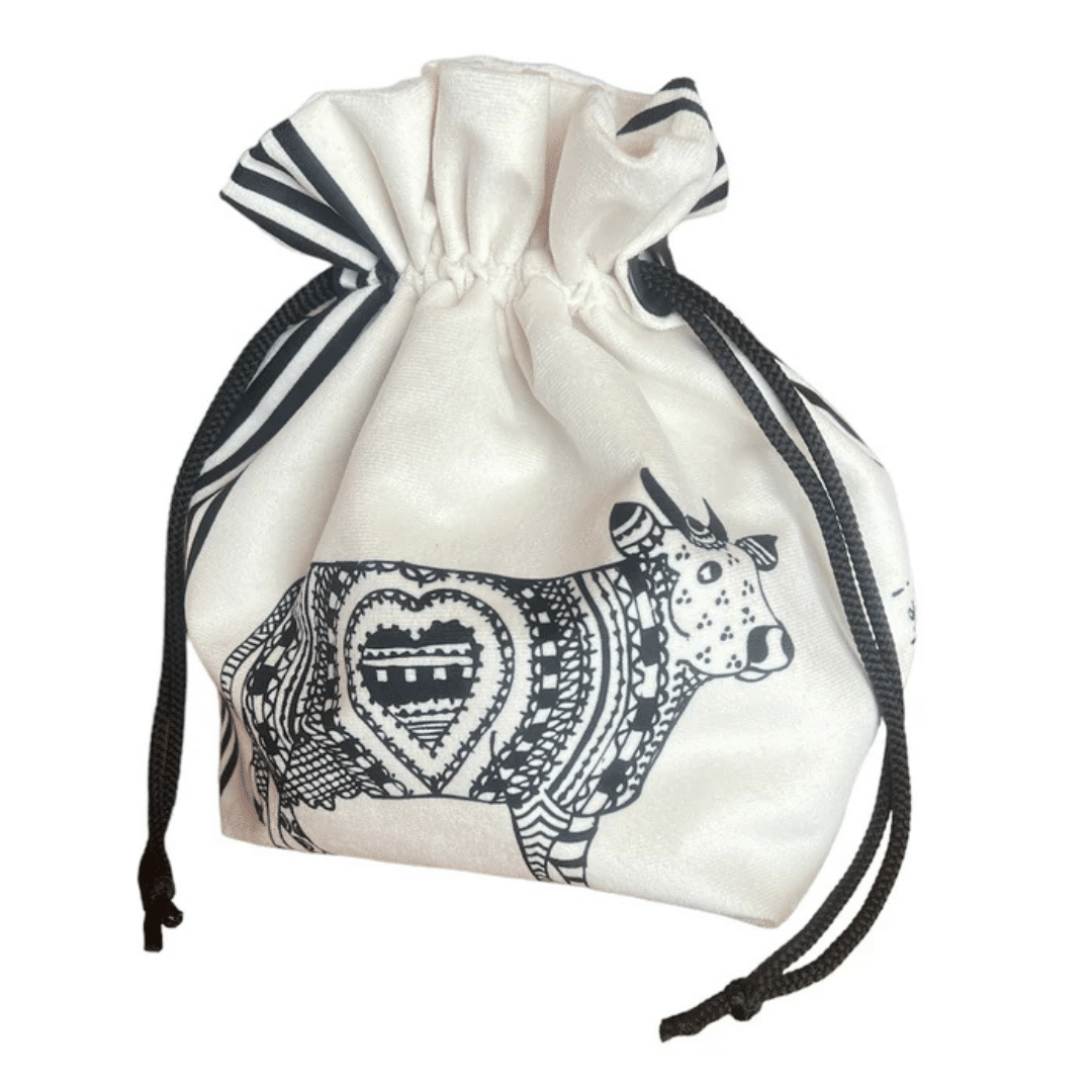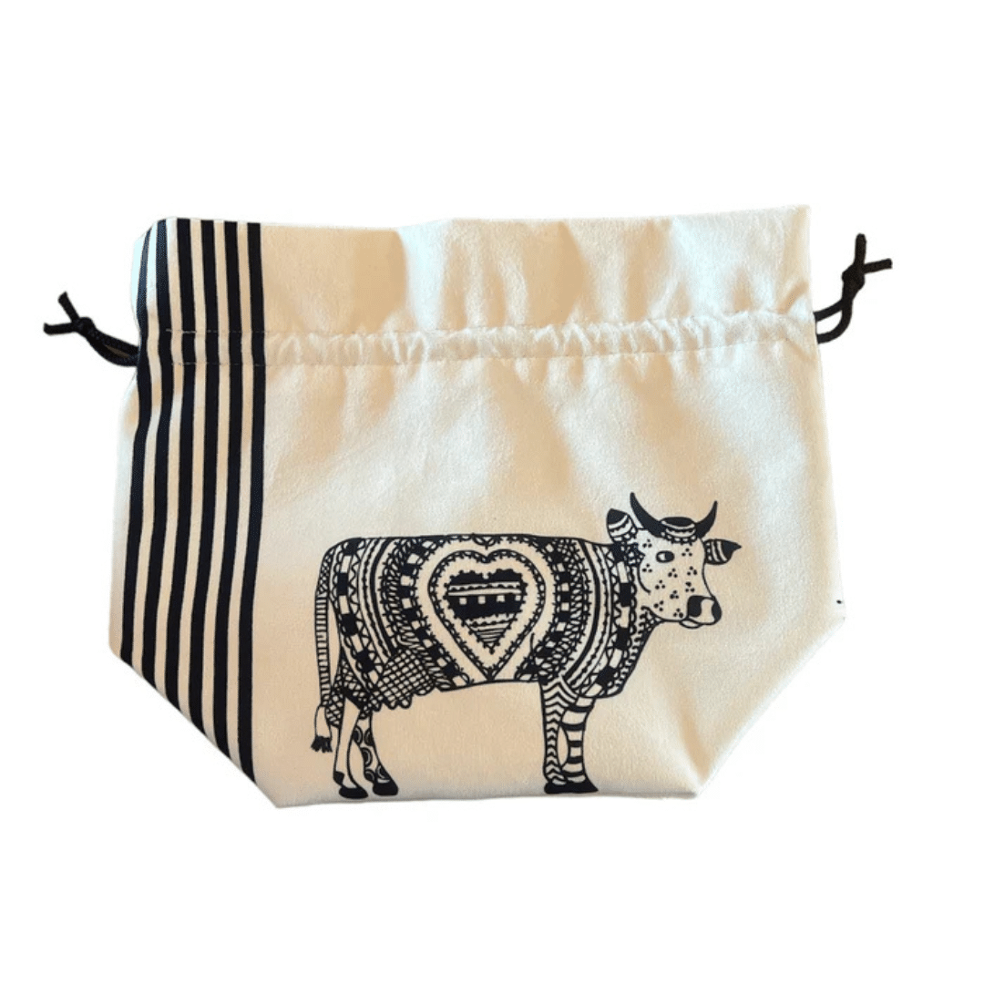 Ce sac en coton doublé, orné d’une vache au look décalé, est idéal pour conserver vos pommes de terre ou votre pain à l’abri de la lumière et de l’humidité. Il allie praticité, durabilité et esthétique, avec un clin d’œil humoristique.
