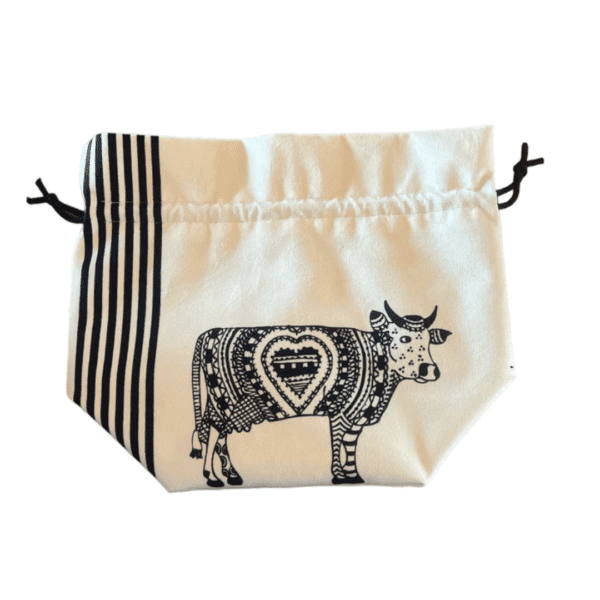 Sac à pommes de terre/pain Oh la vache ! Un sac en coton doublé, orné d’une vache décalée, pratique pour conserver pommes de terre et pain, créé par une illustratrice dans les Alpes vaudoises.