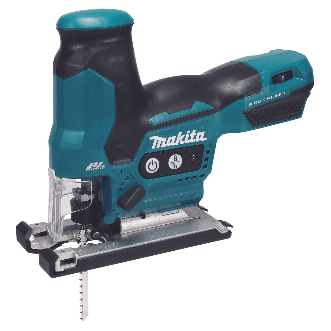 Scie sauteuse sans fil Makita puissante avec base en aluminium orientable, réglage de vitesse et de course du pendule, LED lumineuse et 3 lames fournies.