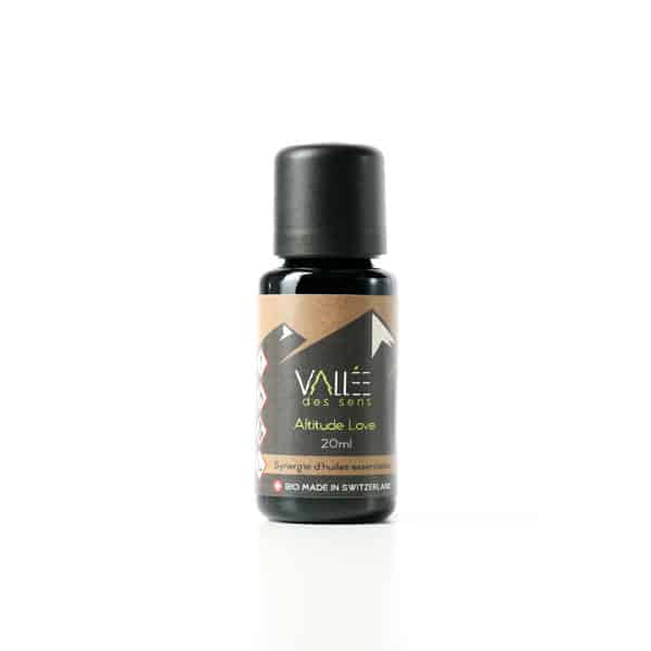 Synergie d’huiles essentielles Altitude Love Bio. Parfum sensuel aux huiles essentielles aphrodisiaques, 100% naturel, made in Switzerland, pour des soirées romantiques.