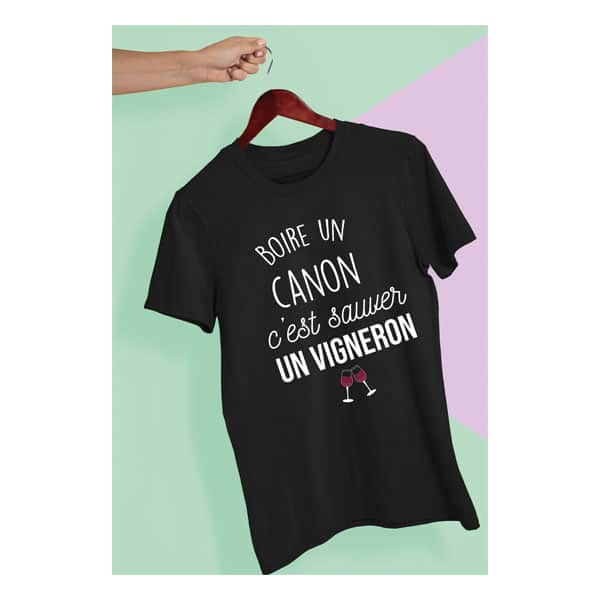 T-shirt boire un canon c’est sauver un vigneron femme : un t-shirt noir en coton bio, sérigraphié, fabriqué en Suisse par Atelier Suisse, disponible du S au XL.