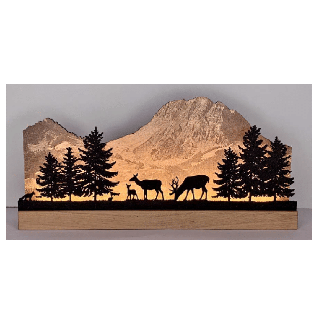 Tableau lumineux LED “Moléson cerf et biche” de la Manufacture Gilbert, décor en bois suisse rechargeable, hommage aux paysages alpins.