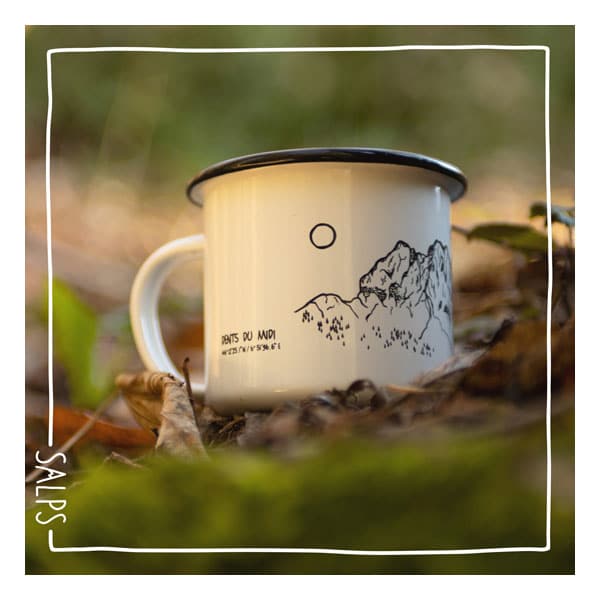Cette tasse en acier émaillé et faite à la main est floquée avec les Dents du Midi.