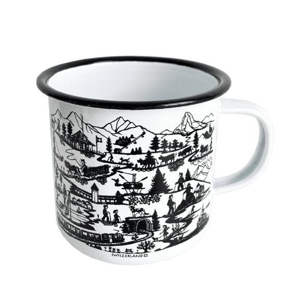 Tasse en émail Poya, incassable et légère. Motifs découpages traditionnels suisses, idéale pour les randos et pique-niques. Contenance 300 ml, partenaire Cotfer.