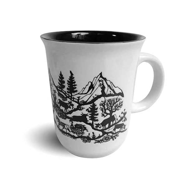 Tasse en porcelaine Découpage Poya, un cadeau traditionnel fribourgeois. Design en relief, intérieur noir, contenance 3,5 dl. Un souvenir authentique à offrir.