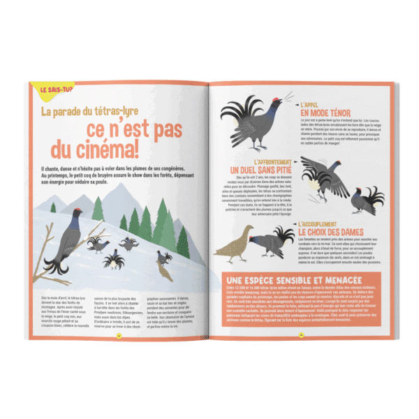 Vos enfants partent à la découverte du réveil des marmottes, assistent à la parade du tétras-lyre et suivent une journée avec un pêcheur au lever du jour. Ils sèment des légumes au jardin, construisent un narcisse en papier, découvrent les asperges sous un nouveau jour et plongent dans la tradition du championnat des tracassets. Recettes printanières, balade avec les chèvres de Gruyères, jeux, lectures et frites à déguster complètent ce numéro pétillant !