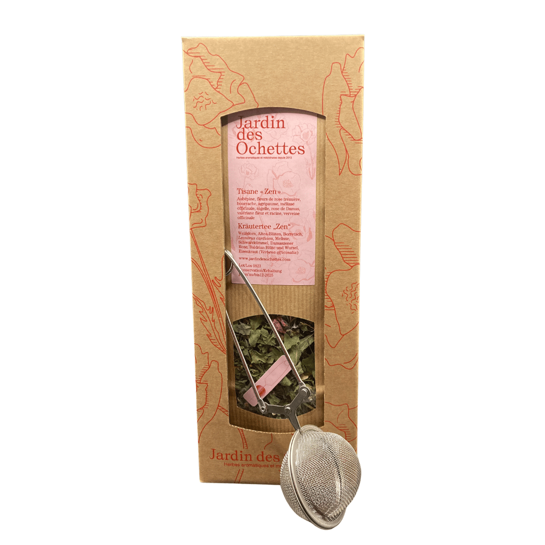 Tisane Zen : un mélange apaisant de plus de 70 plantes médicinales et aromatiques, récoltées au Jardin des Ochettes face au Mont-Blanc, pour traverser sereinement les journées difficiles.