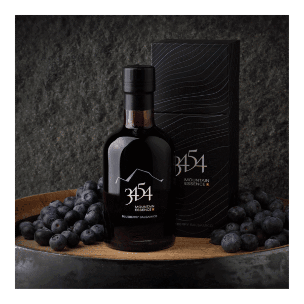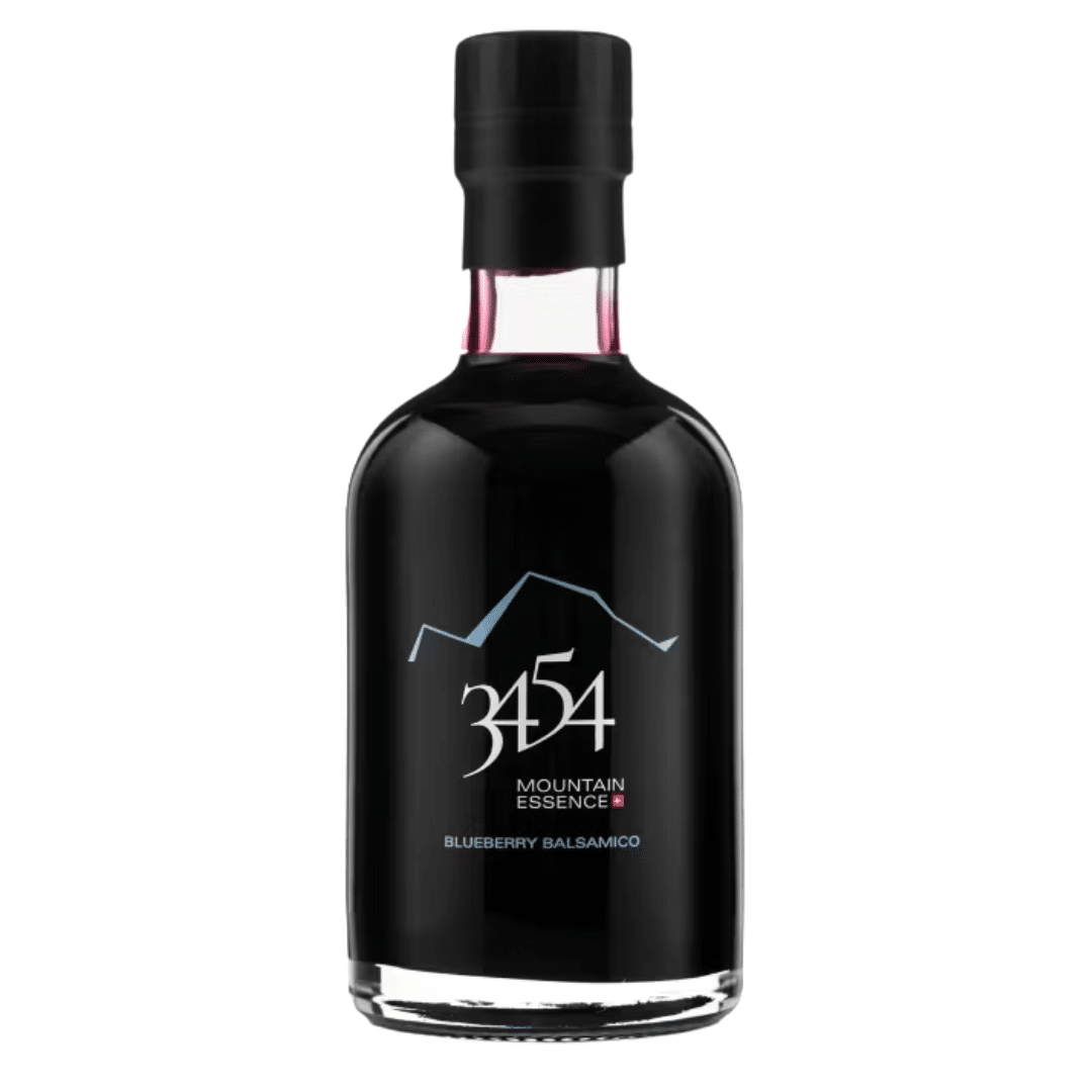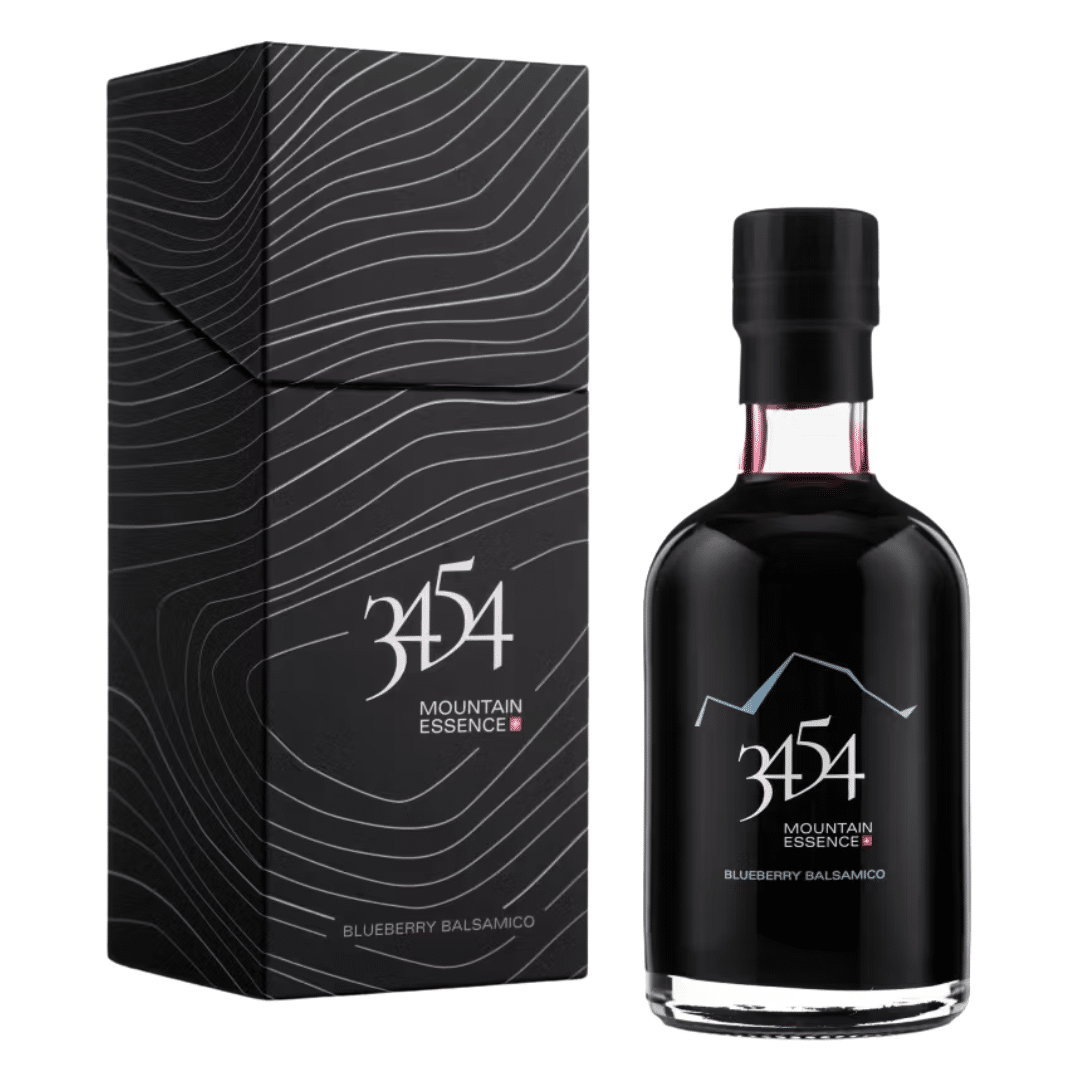 Découvrez le 3454 Mountain Essence à la myrtille, un vinaigre balsamique suisse d’exception qui marie la richesse aromatique de la myrtille à un balsamique vieilli dix ans dans des fûts de chêne français, à 3454 mètres d’altitude dans les Alpes suisses.