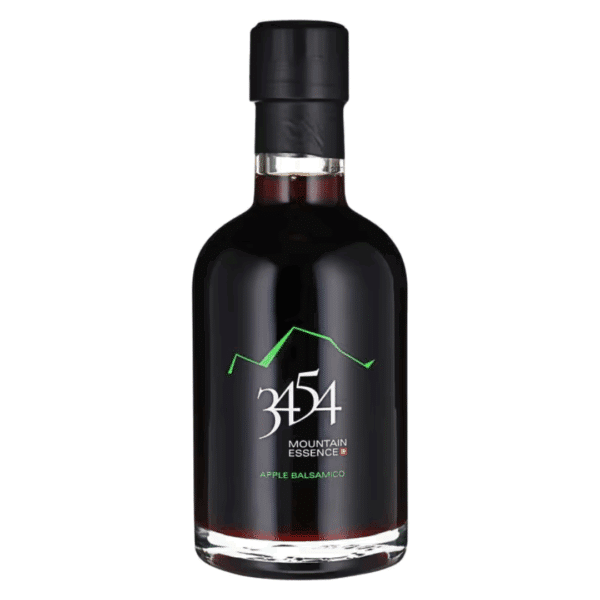 Vinaigre balsamique à la pomme 3454 Mountain Essence : un condiment artisanal suisse, vieilli 10 ans, élaboré avec des fruits mûrs et plébiscité par des chefs étoilés.