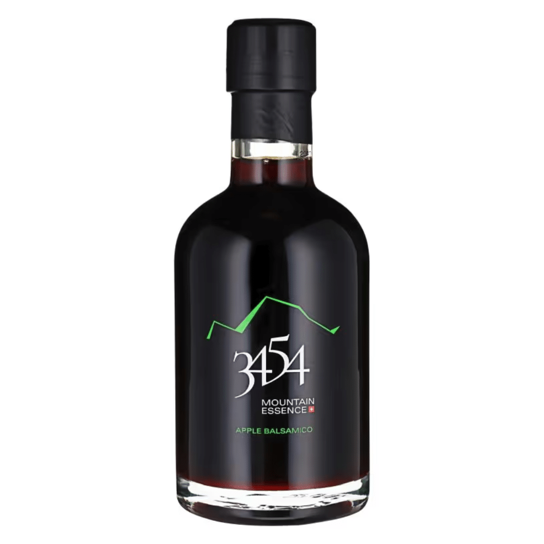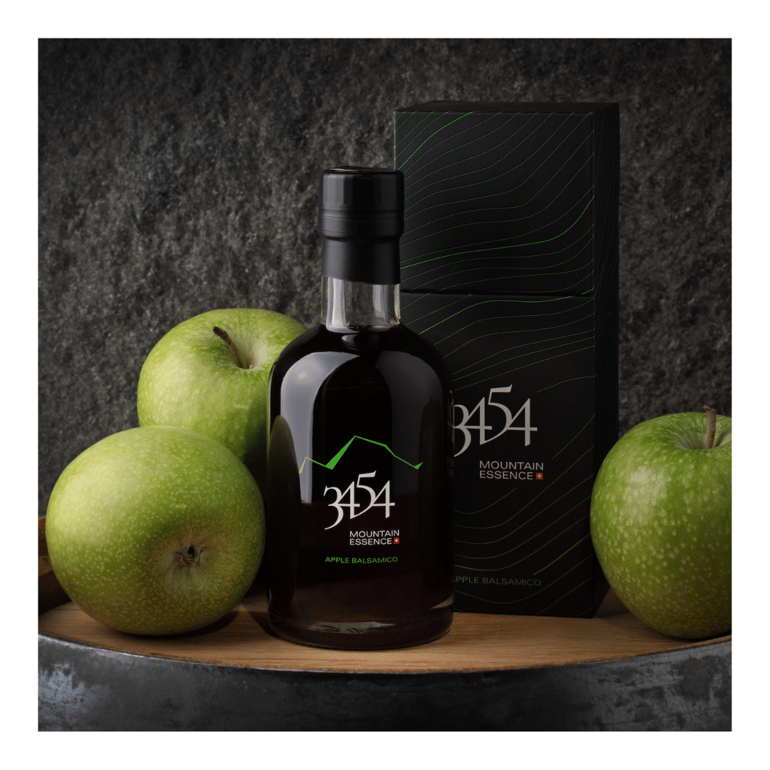 Découvrez le 3454 Mountain Essence à la pomme, un vinaigre balsamique suisse d’exception qui marie la douceur fruitée de la pomme à la richesse d’un balsamique vieilli dix ans dans des fûts de chêne français, à 3454 mètres d’altitude dans les Alpes suisses.