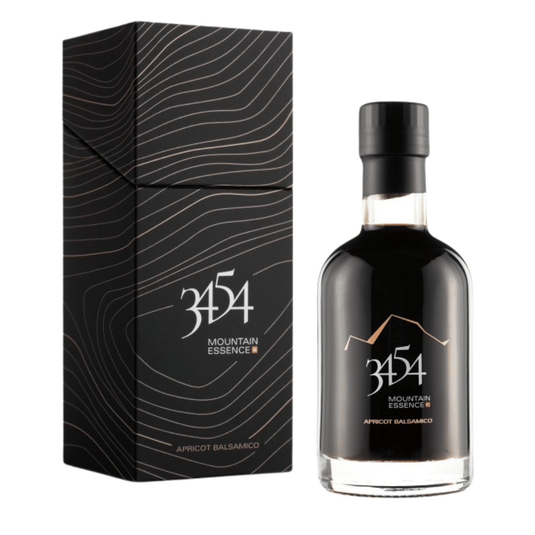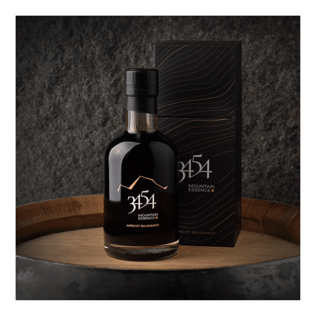 Découvrez le 3454 Mountain Essence à l’abricot, un vinaigre balsamique suisse d’exception qui marie la douceur délicate de l’abricot à un balsamique vieilli dix ans dans des fûts de chêne français, à 3454 mètres d’altitude dans les Alpes suisses.