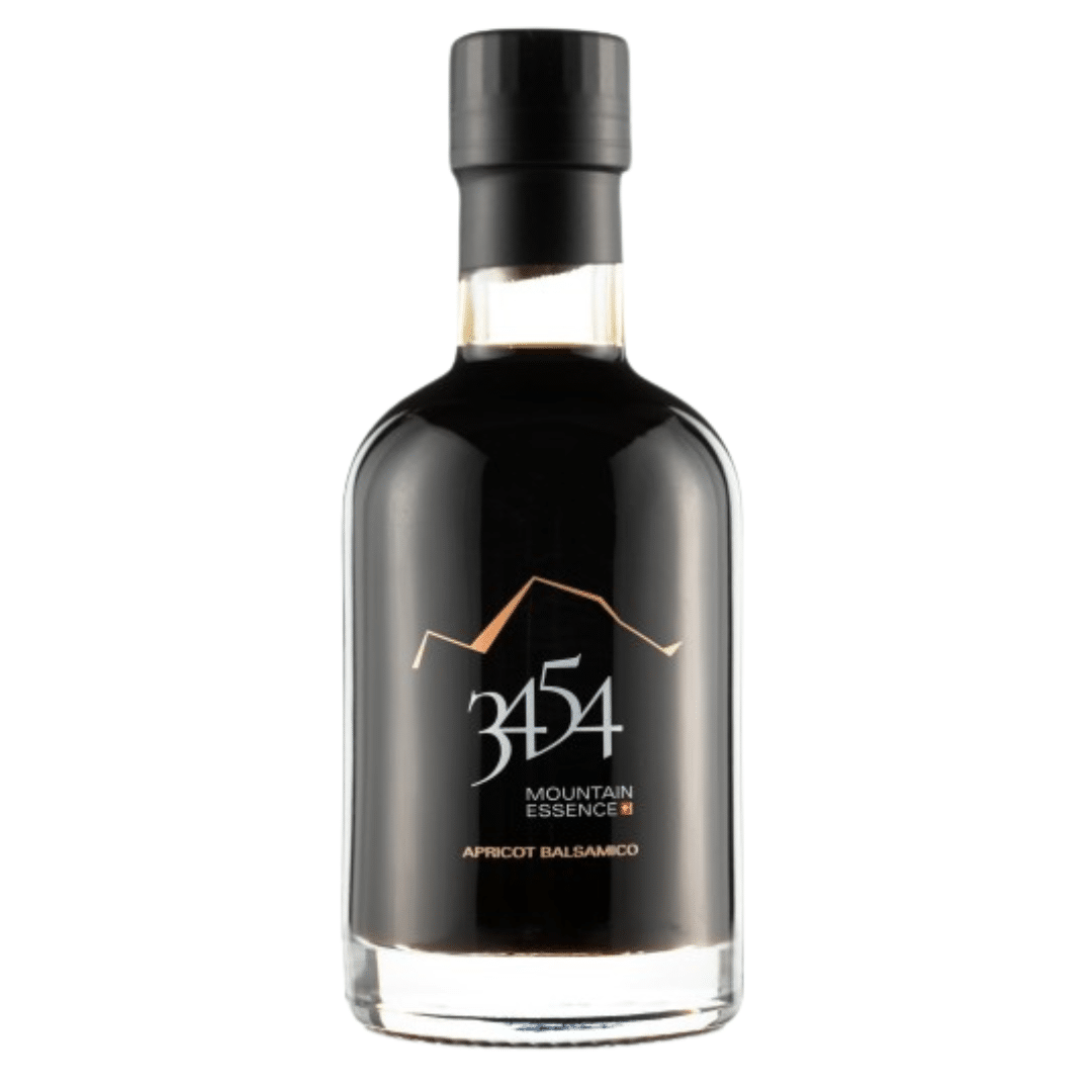 Vinaigre balsamique à l’abricot 3454 Mountain Essence : un condiment naturel suisse, vieilli 10 ans, élaboré avec des fruits mûrs et plébiscité par des chefs étoilés.